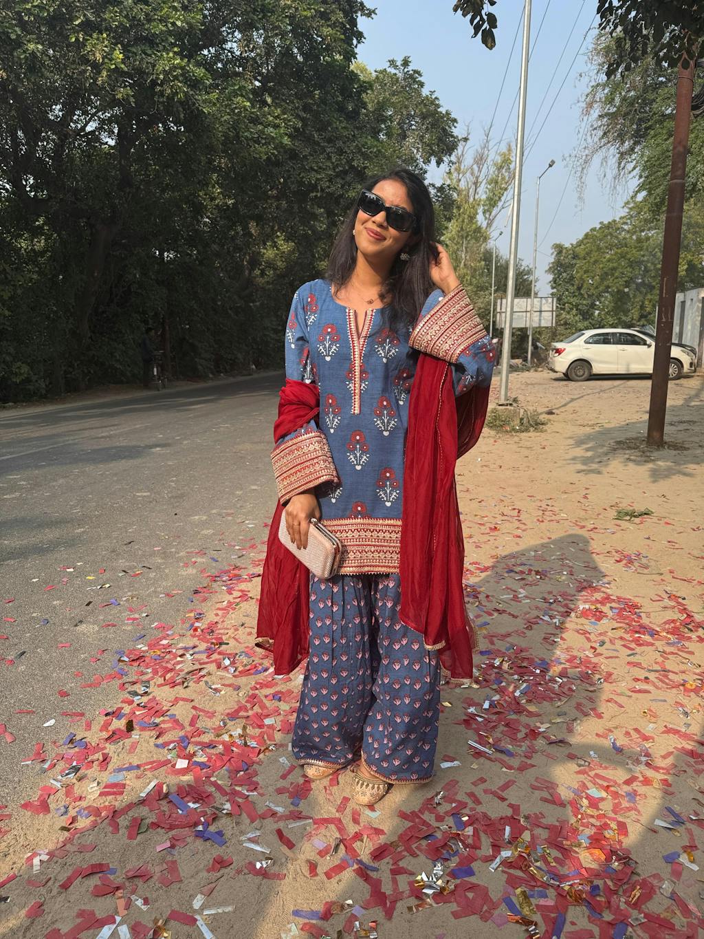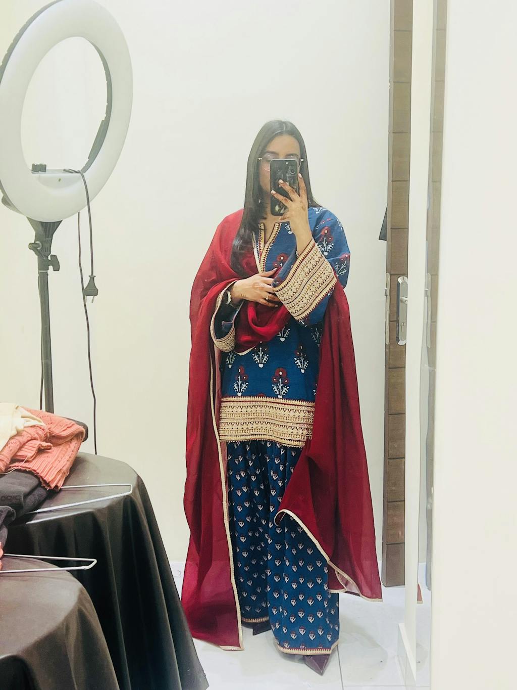 Made with breathable cotton fabric, the kurta ensures comfort throughout the day, while the soft organza dupatta adds a touch of delicacy and completes the overall look with lightness and flow. This balance of fabrics makes it a practical yet elegant choice for celebrations.